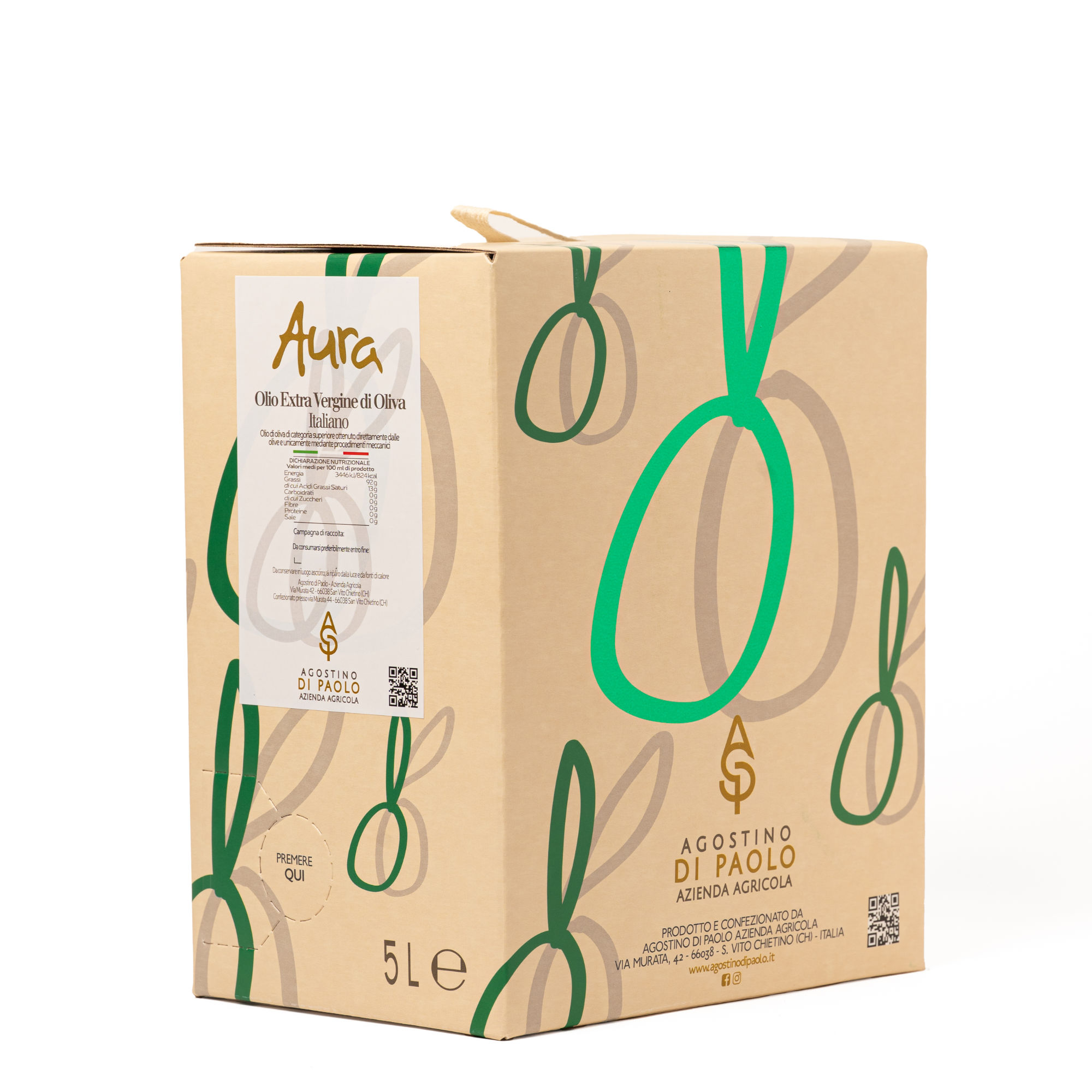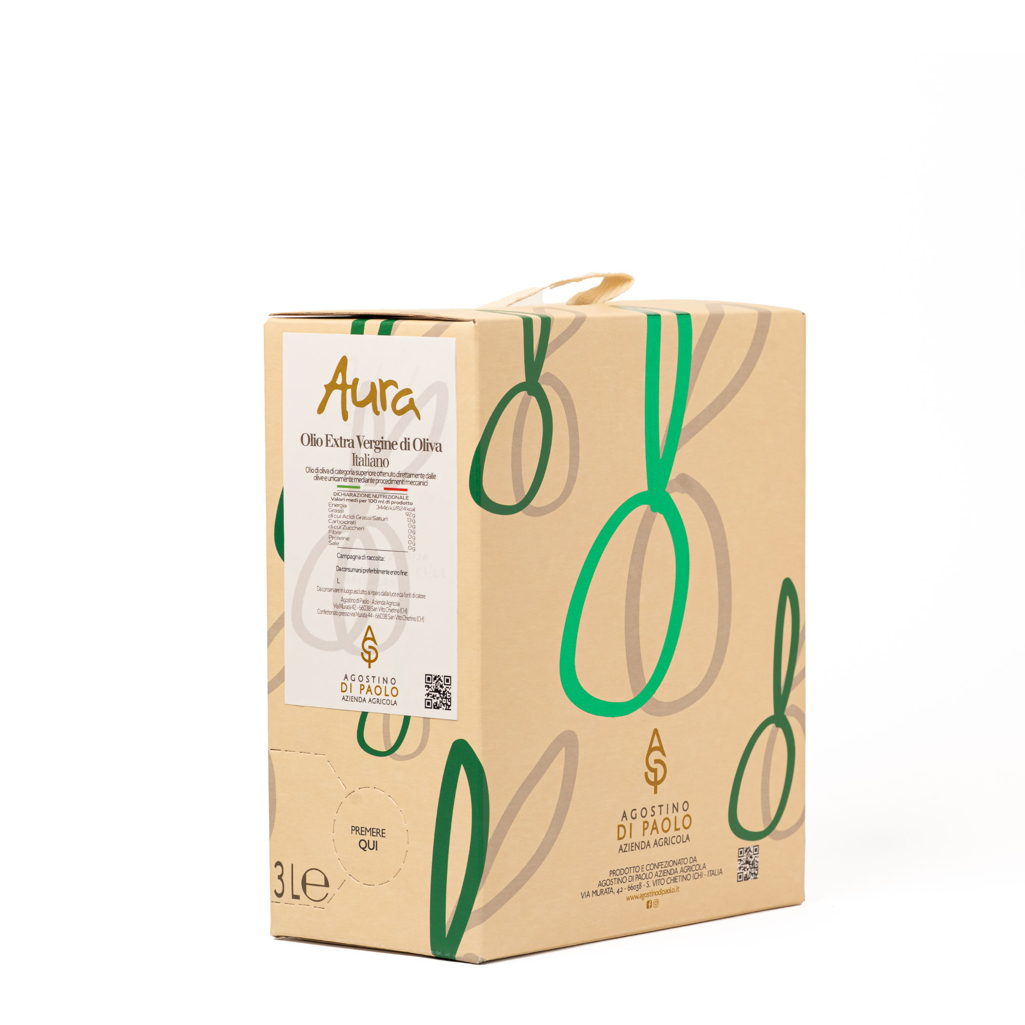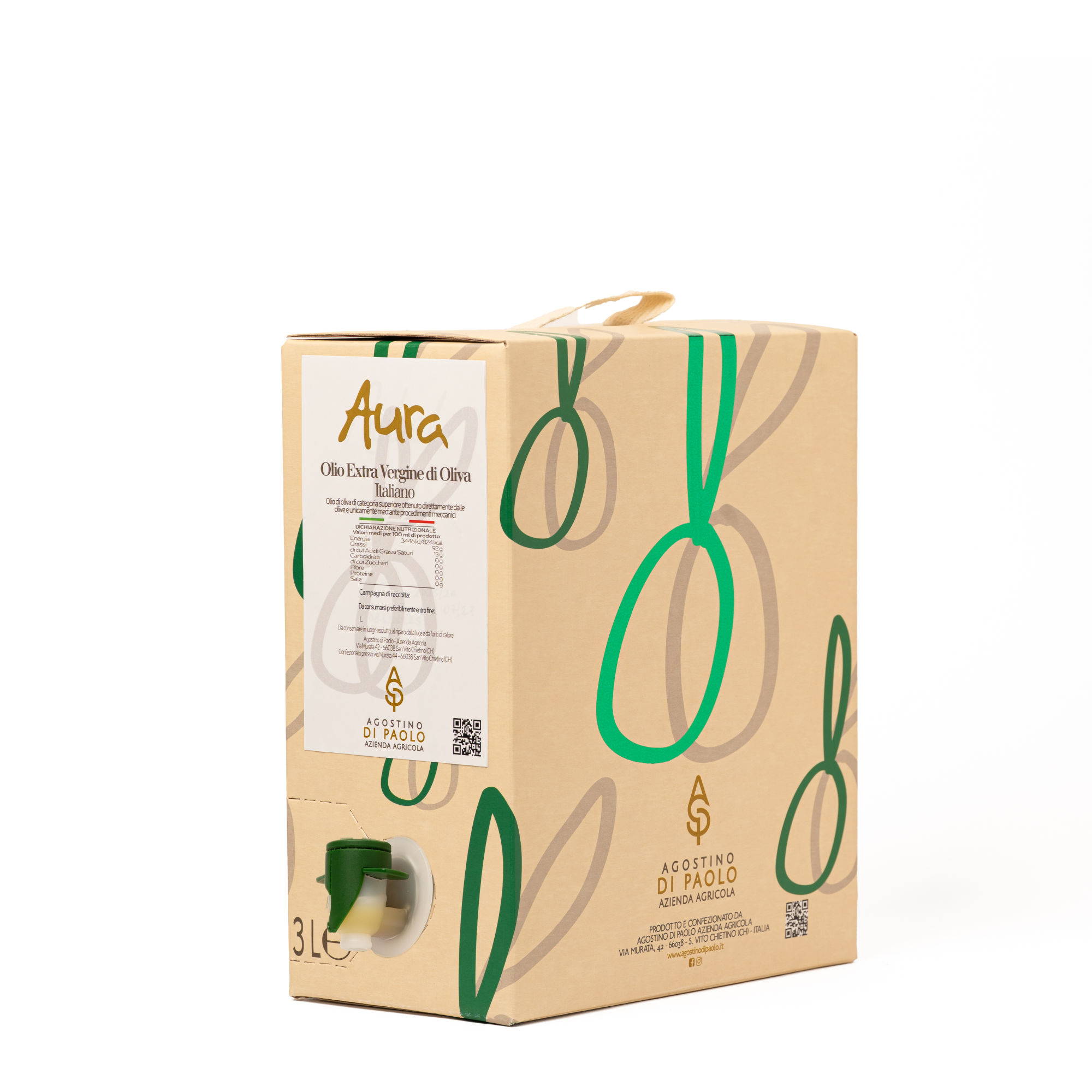 Nel formato bag in box, Aura unisce la qualità del nostro olio extravergine di oliva alla praticità di utilizzo quotidiano, permettendo di conservarlo al meglio anche dopo l’apertura.
