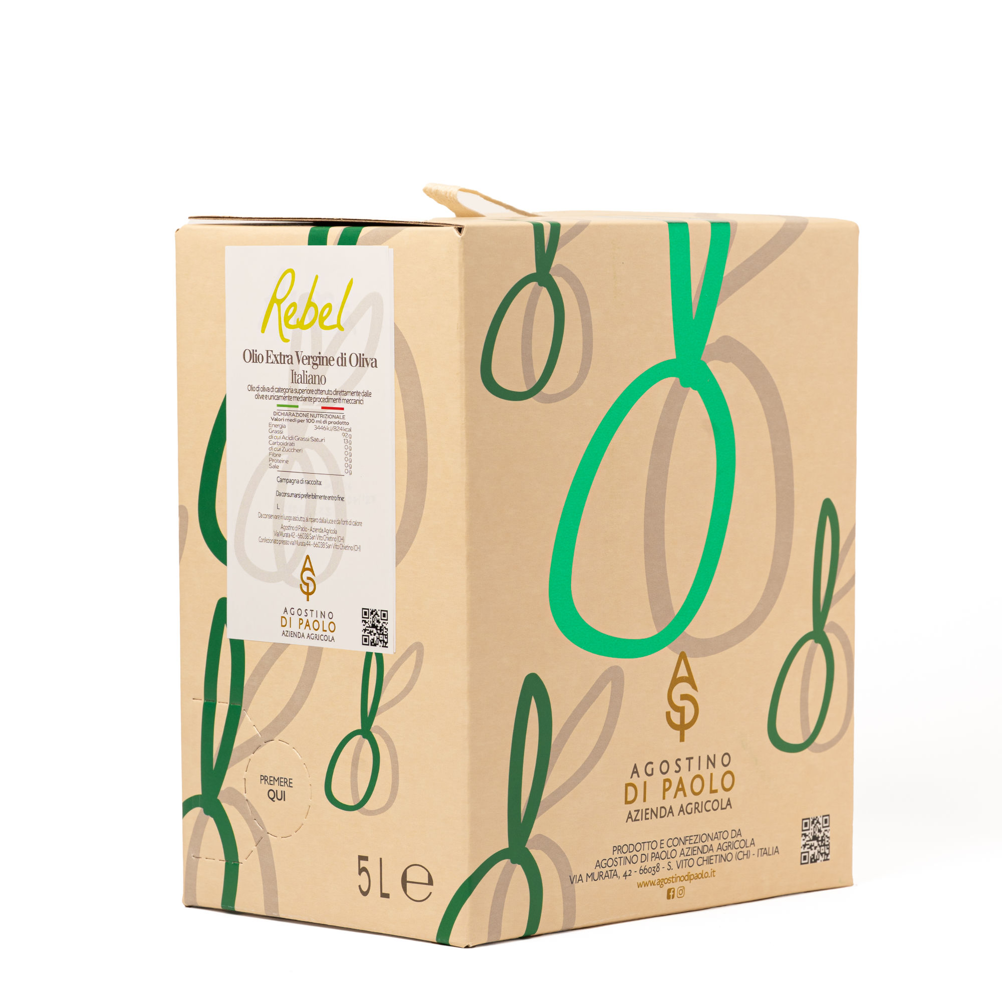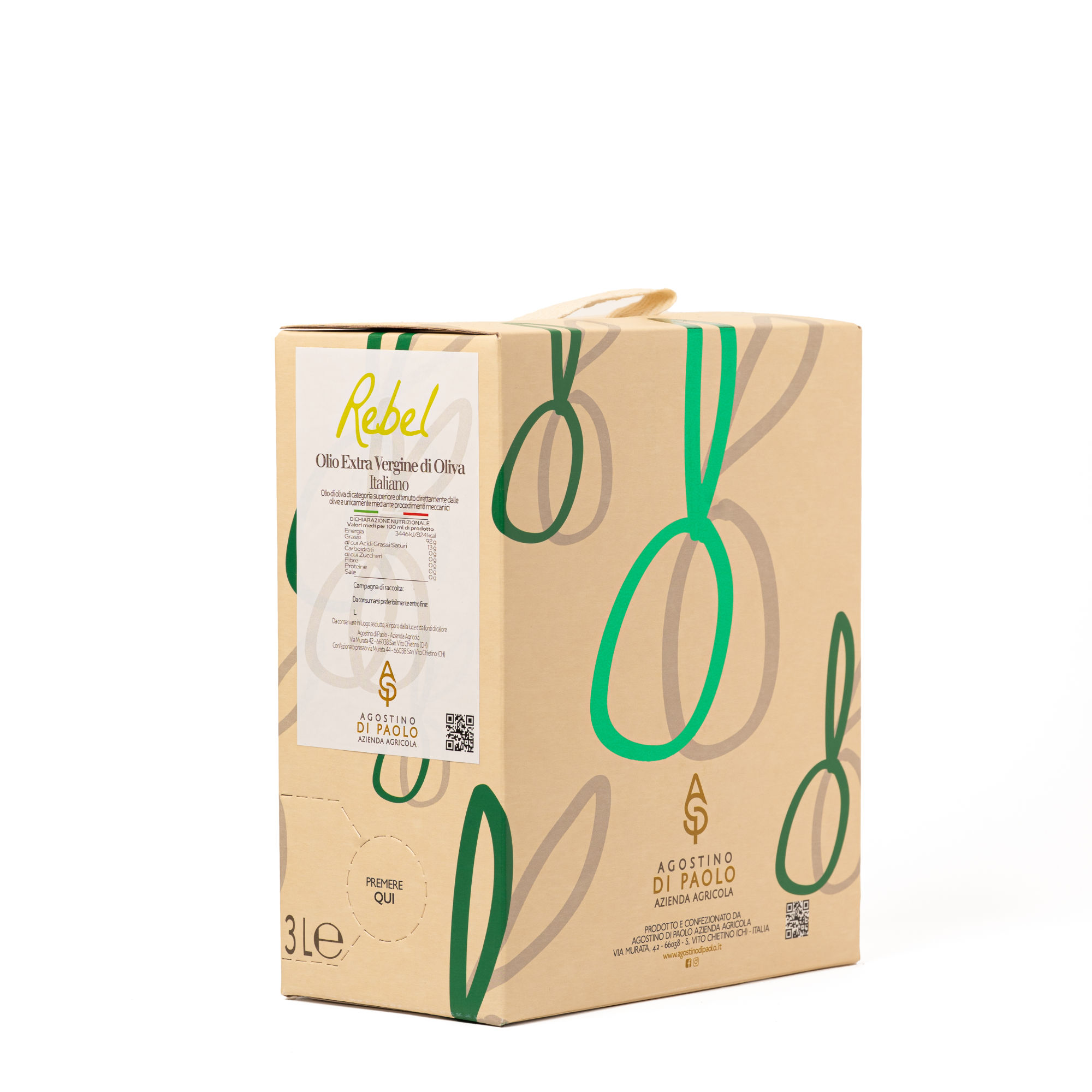 Nel formato bag in box, Rebel unisce il carattere del nostro olio extravergine di oliva alla praticità di utilizzo quotidiano, permettendo di conservarlo al meglio anche dopo l’apertura.